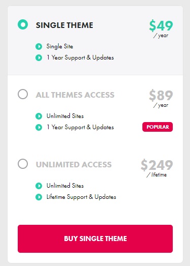 Price: The yearly access to Elegant Themes which includes Divi and other themes costs $89. While a one-time fee of $249 for lifetime access to Elegant Themes.